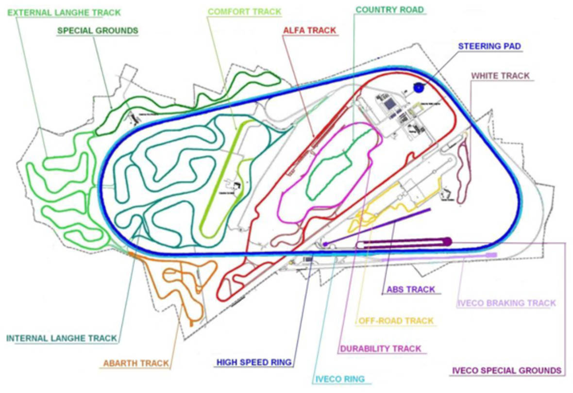 Today the complex belongs to the FCA Group and is used to test both commercial and non-commercial vehicles. The original circuit has been extended to include a fast race track, a 22-km long "Langhe" circuit and an "off road" section used to test performance and durability in different terrain conditions.